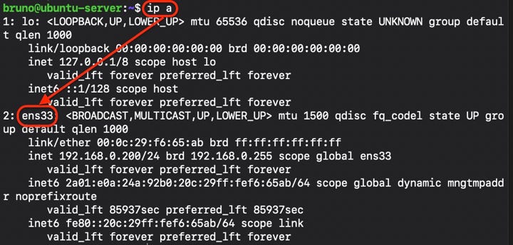 Remplacer "ens33" par votre interface réseau, vous pouvez trouver le nom de cette dernière avec la commande ip a, ce qui pour ma part me renvoie ce résultat :